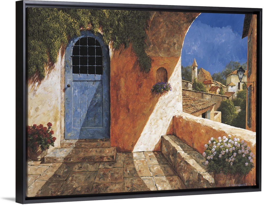 <p>Contemporary artwork of a blue door near an archway in a European village.</p>