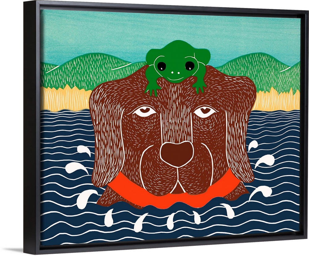 <p>Illustration of a chocolate lab in the water with a green frog on its head.</p>
