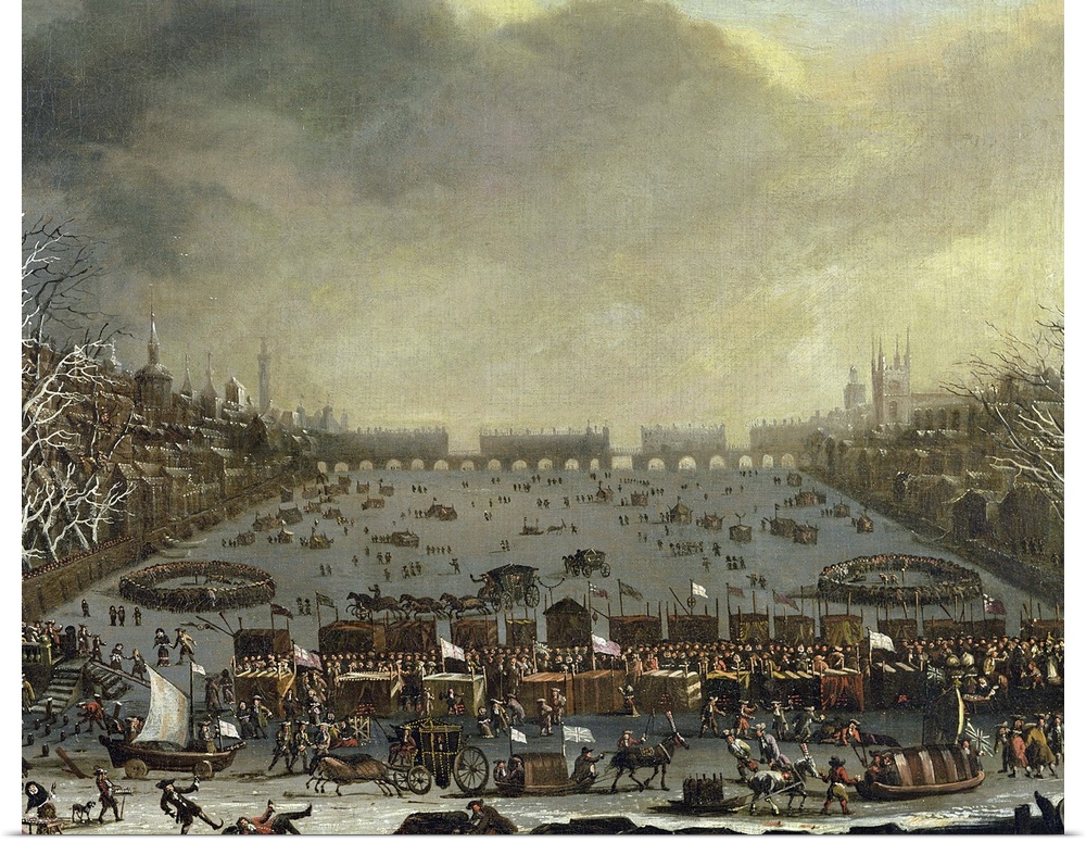 <p>The Frost Fair of the winter of 1683-4 on the Thames, with Old London Bridge in the Distance. c.1685 (oil on canvas) by English School, (17th century)</p>