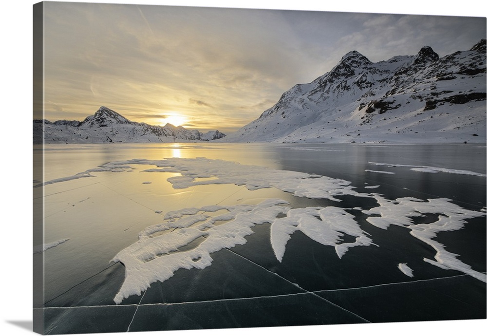 <p>The frozen surface of Lago Bianco framed by snowy peaks at dawn, Bernina Pass, canton of Graubunden, Engadine, Switzerland</p>