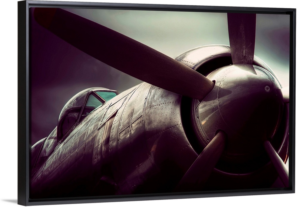 <p>Big, horizontal, close up, fine art photograph of a SeaFury T20, showing the propeller and cockpit, against a blurred background.</p>