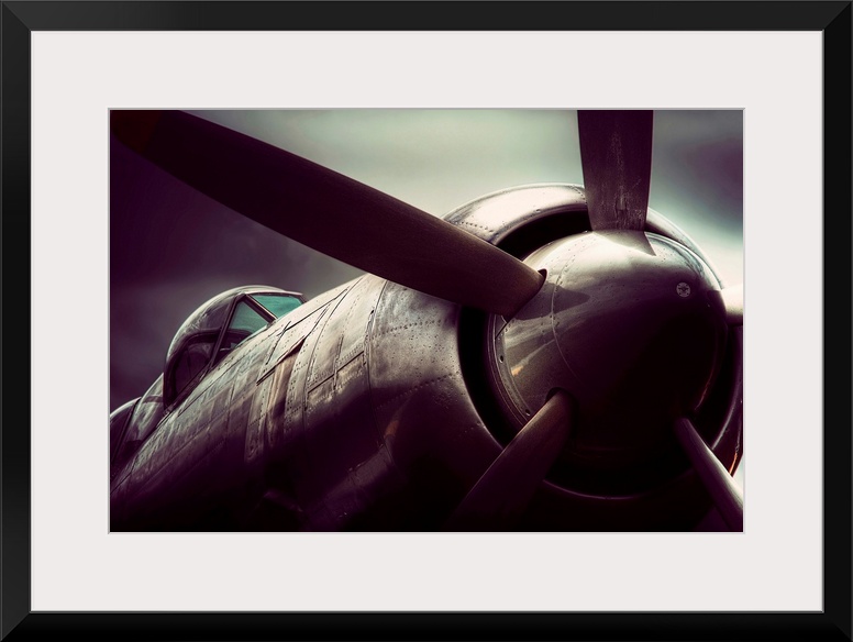 <p>Big, horizontal, close up, fine art photograph of a SeaFury T20, showing the propeller and cockpit, against a blurred background.</p>