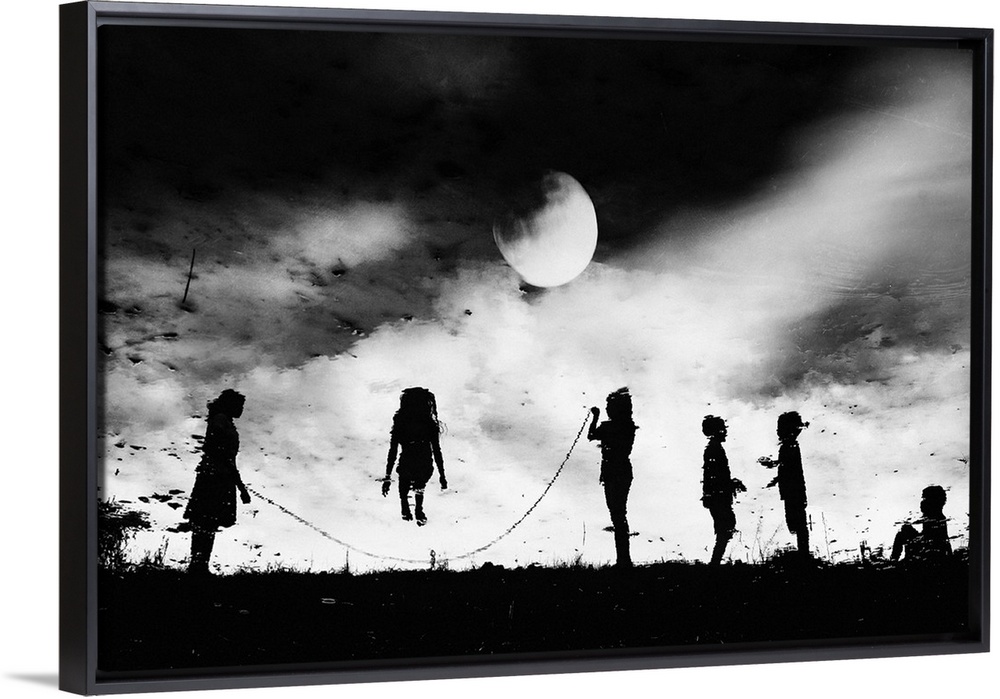 <p>Children in silhouette jumping rope under the moonlight.</p>