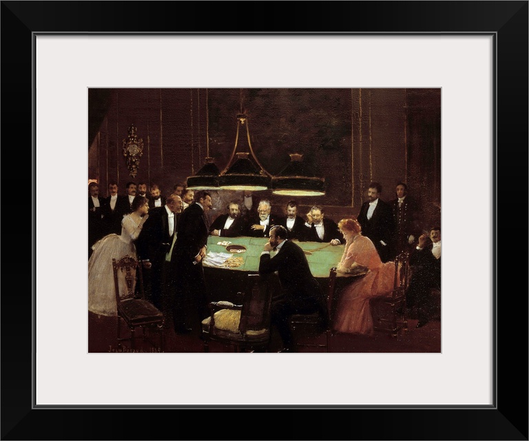 <p>The Game Room. Croupiers and men in dark suits around a gaming table playing roulette in a casino. Painting by Jean Beraud (1849-1935) 1889. 0,38 x 0,53 m. Carnavalet Museum, Paris</p>