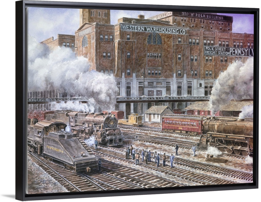 <p>Contemporary painting of a rail yard, with large clouds of smoke billowing from the train stacks.</p>