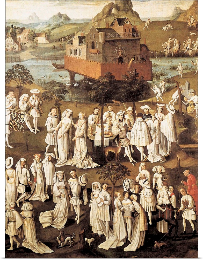 <p>The Garden of Love at the Court of Philip the Good, Duke of Burgundy, in the Gardens of the Chateau de Hesdin in 1431. 16th c. Central detail of the courtiers. Oil on canvas. FRANCE. Versailles. National Museum of Versailles. .. AISA/Everett Collection</p>