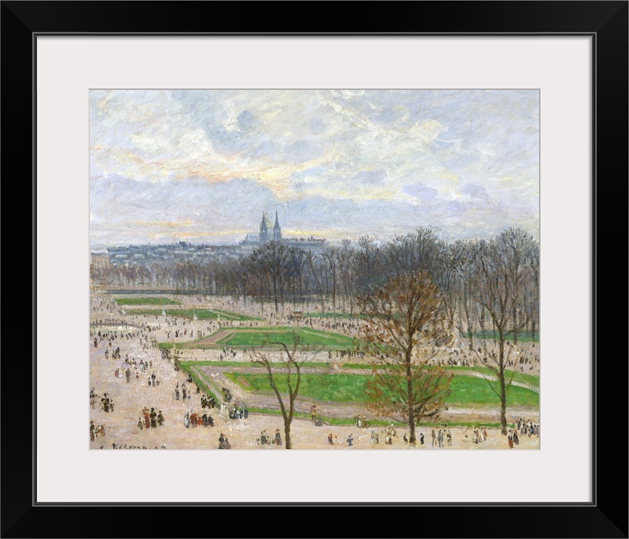 <p>In December 1898 Pissarro wrote from Paris that he had engaged an apartment at 204 rue de Rivoli, opposite the Tuileries, with a superb view of the garden, the Louvre to the left, in the background the houses on the quays behind the trees, to the right the Dome des Invalides, and the steeples of Sainte-Clotilde behind clumps of chestnut trees. It's very beautiful. I shall have a fine series to paint. During the following winter and spring he painted eight cityscapes looking toward the Louvre, and six, like this one, of the Tuileries Gardens with Sainte-Clotilde in the background.</p>