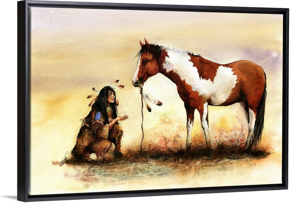 <p>A Native American Indian girl offers a treat to an Indian pony. Originally painted with watercolour on paper.</p>