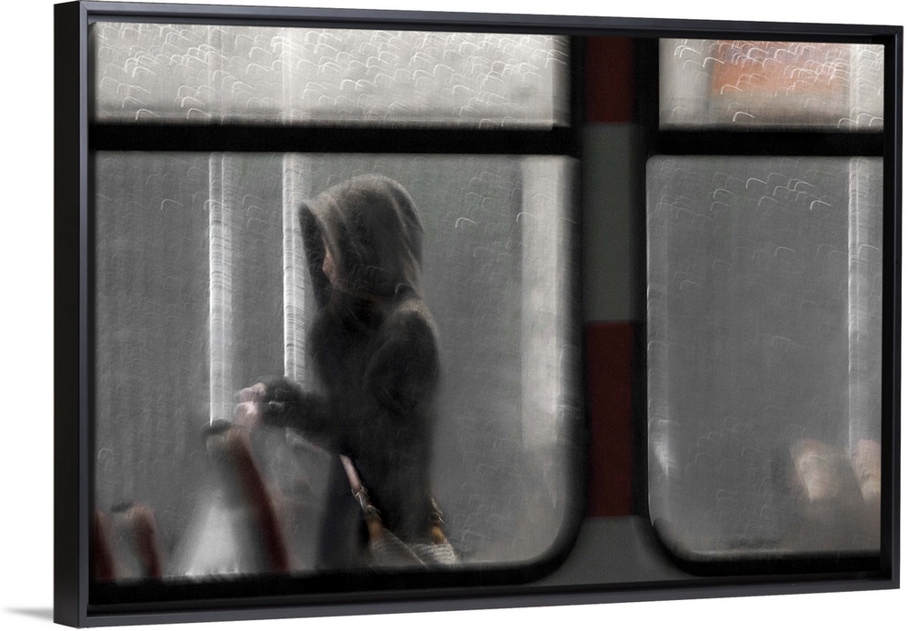 <p>A women wearing a hood walking down the aisle of a train seen through the window.</p>
