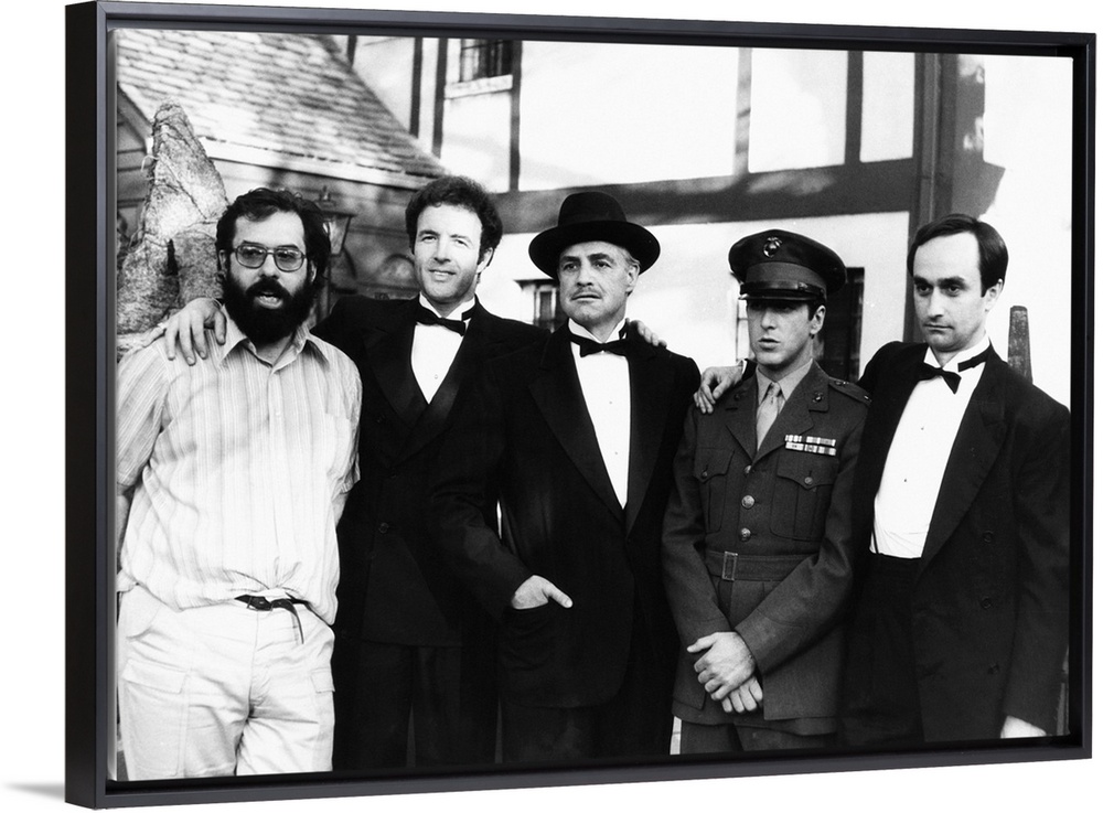 <p>THE GODFATHER, from left, director Francis Ford Coppola, James Caan, Marlon Brando, Al Pacino, John Cazale, on-set, 1972.</p>