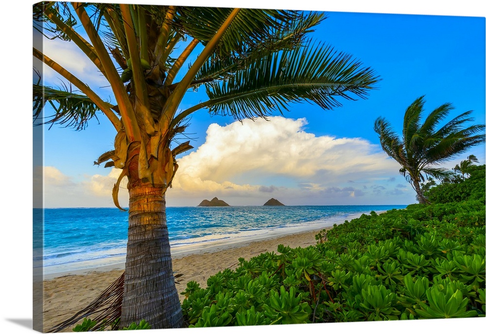 <p>The golden sand and surf on Lanikai Beach with a view of the Mokulua Islands off the coast at sunrise; Oahu, Hawaii, United States of America.</p>