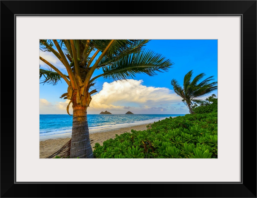 <p>The golden sand and surf on Lanikai Beach with a view of the Mokulua Islands off the coast at sunrise; Oahu, Hawaii, United States of America.</p>