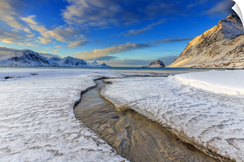 <p>The golden sunrise reflected in a clear stream of the sea where the snow has melted, Haukland, Lofoten Islands, Arctic, Norway, Scandinavia, Europe</p>