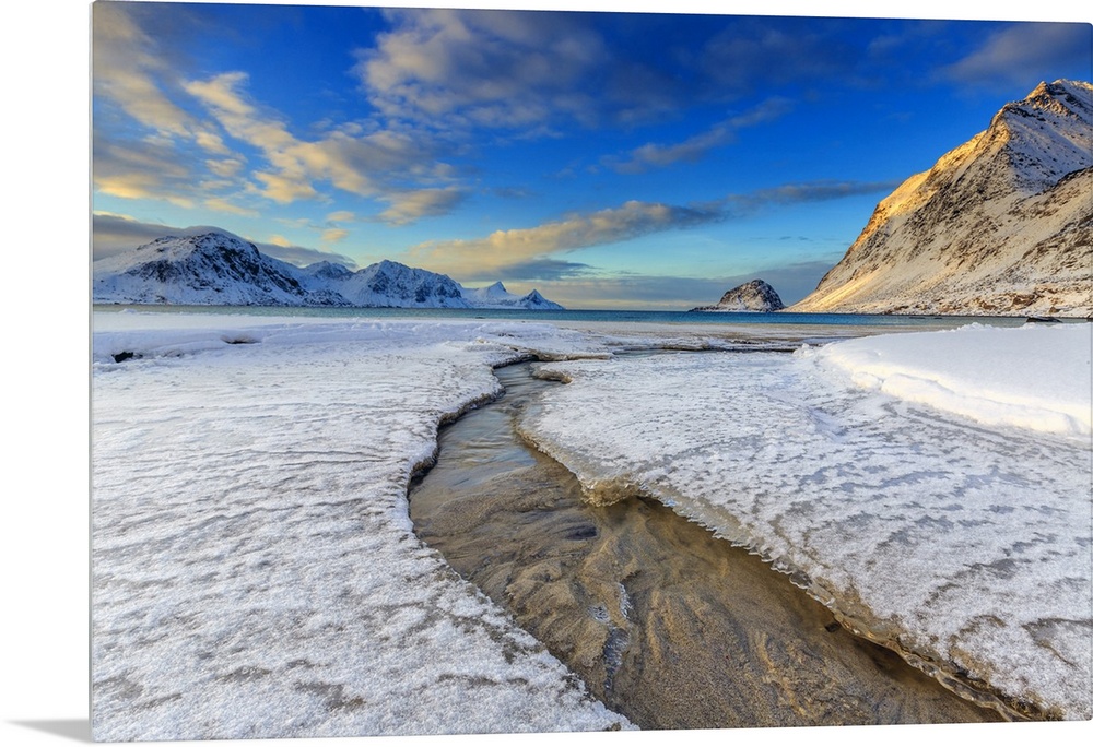 <p>The golden sunrise reflected in a clear stream of the sea where the snow has melted, Haukland, Lofoten Islands, Arctic, Norway, Scandinavia, Europe</p>