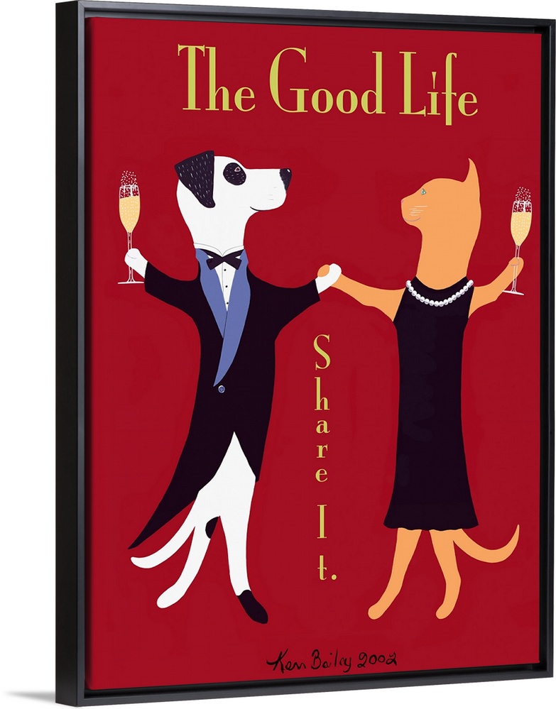 <p>Huge retro art composed of a dog in a tuxedo and a cat in a dress enjoying a glass of champagne while they dance against a solid colored background.</p>