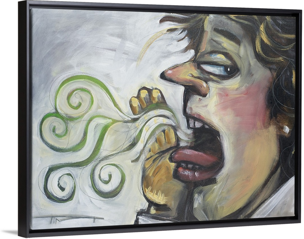 <p>Cartoonish painting of a person spreading rumors as if they were bad breath.</p>