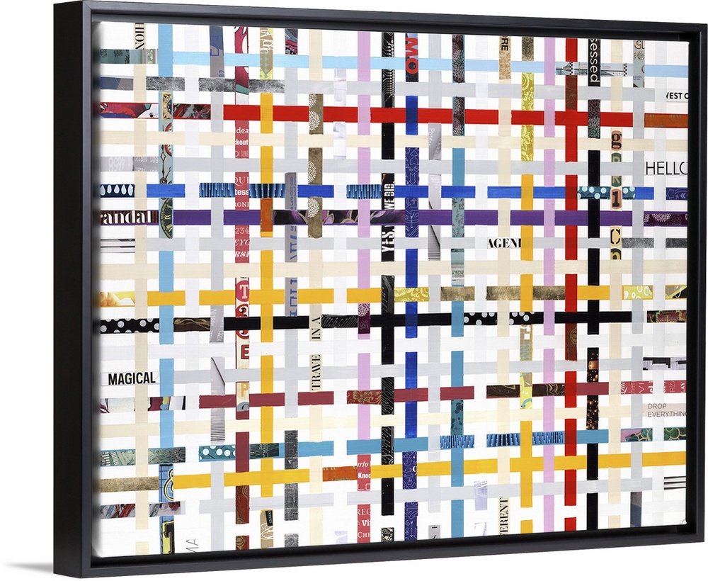 <p>Mix media artwork of weaving stripes of color and images.</p>