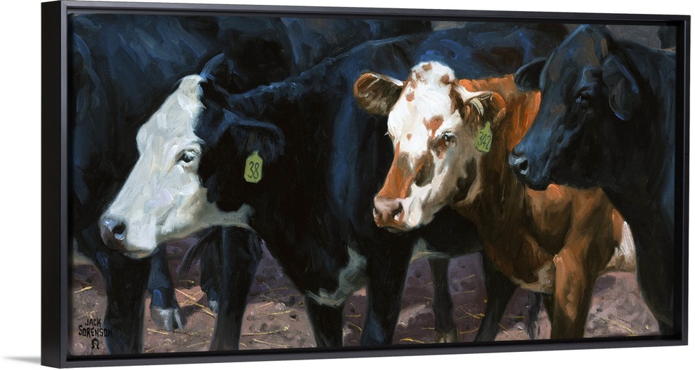 <p>Contemporary painting of three cows standing in a herd.</p>