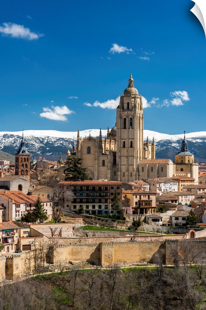 <p>City Skyline With The Gothic Cathedral And The Snowy Mountains Of Sierra De Guadarrama In The Background, Segovia, Castile And Leon, Spain</p>