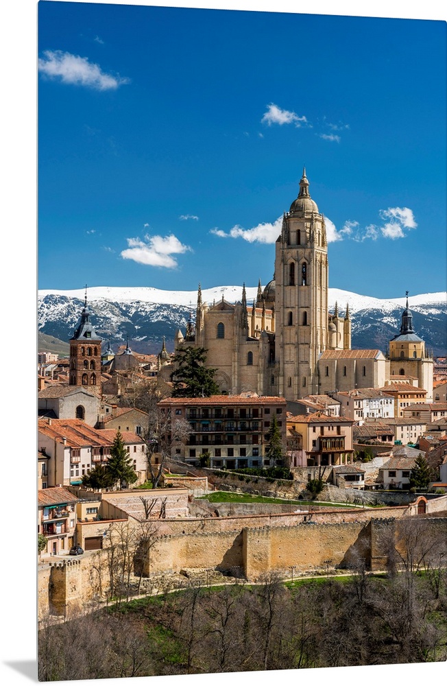 <p>City Skyline With The Gothic Cathedral And The Snowy Mountains Of Sierra De Guadarrama In The Background, Segovia, Castile And Leon, Spain</p>