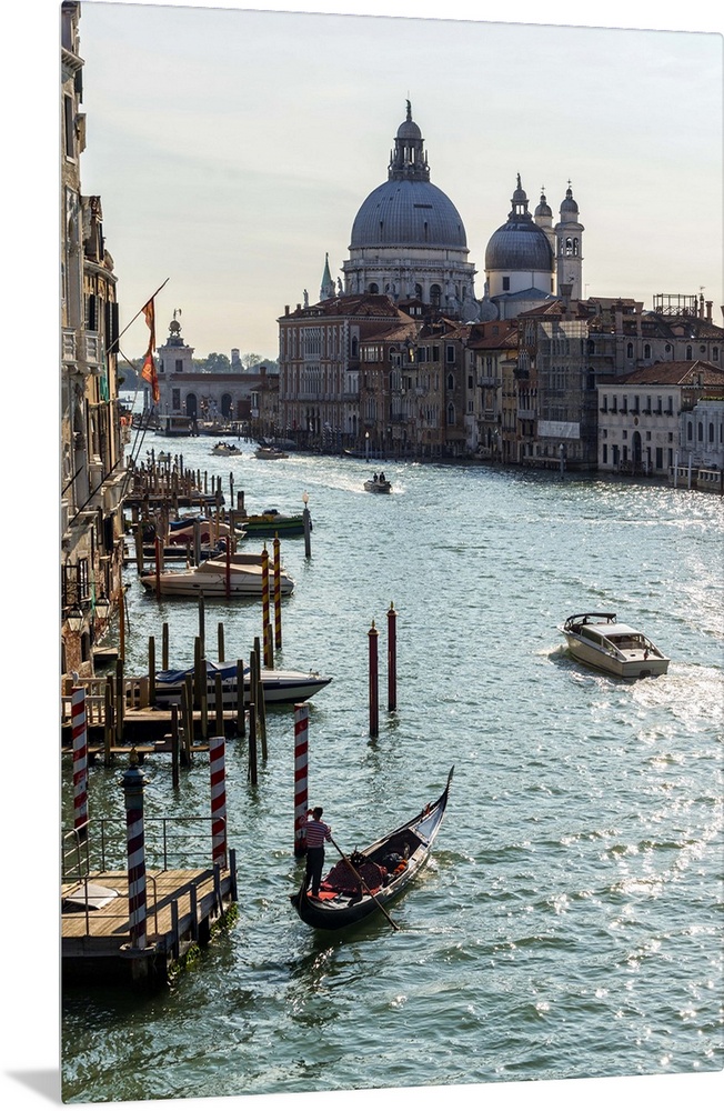 <p>Landscape photograph of gondolas and boats on the Grand Canal with Santa Maria della Salute in the background.</p>