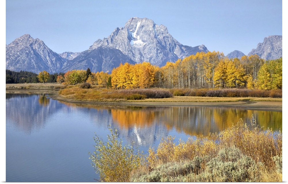 <p>The Grand Tetons in Grand Teton National Park reflecting fall colors in the Snake River, Wyoming, United States of America</p>