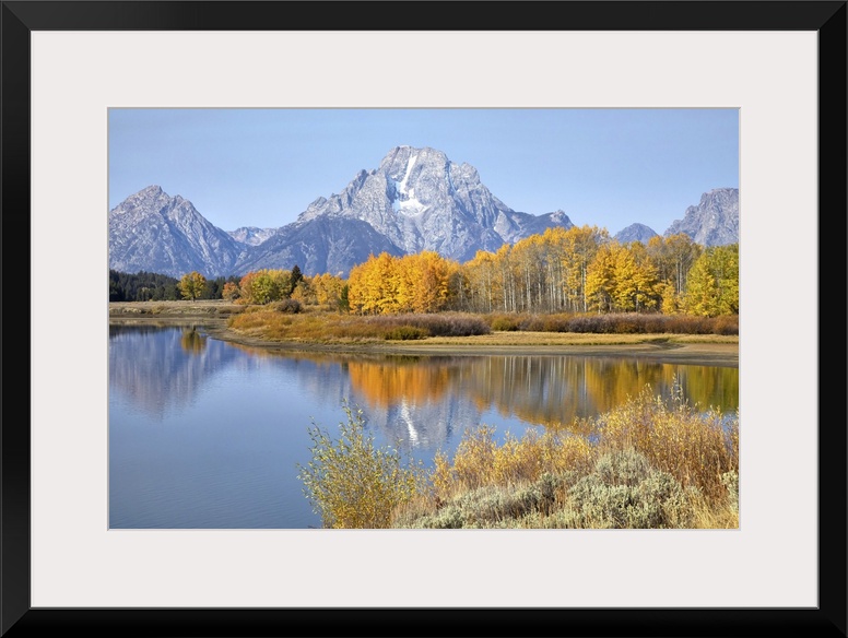 <p>The Grand Tetons in Grand Teton National Park reflecting fall colors in the Snake River, Wyoming, United States of America</p>