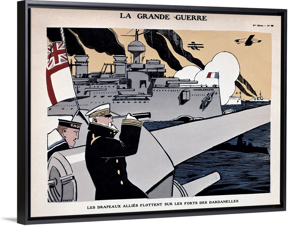 <p>'The Great War.' French poster, c1915, showing Allied ships during a naval battle in the Dardanelles strait during World War I.</p>