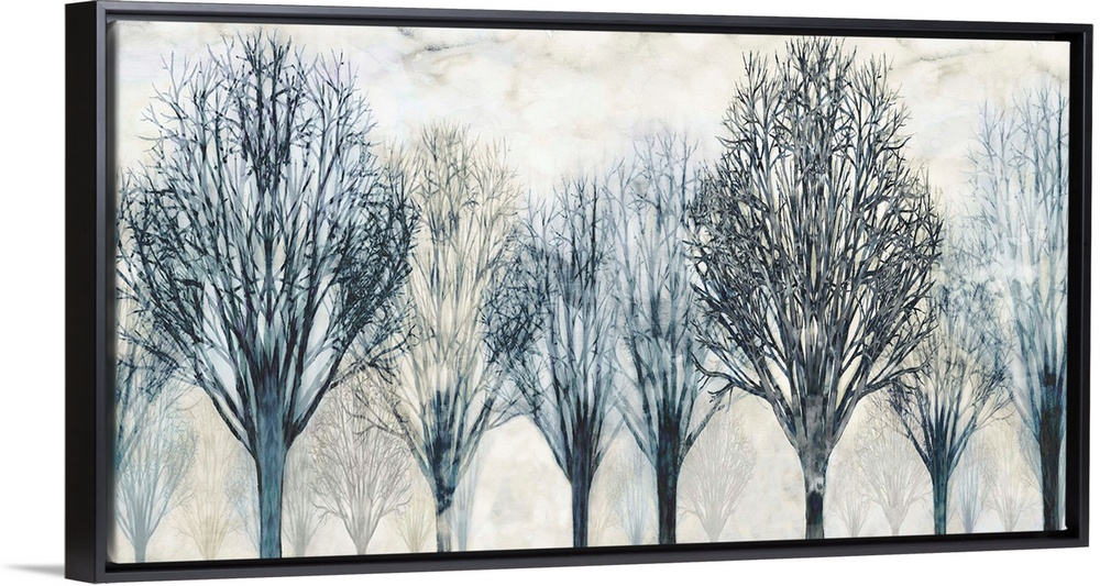 <p>Large artwork with Winter trees in dark blue and gray hues with a foggy background.</p>