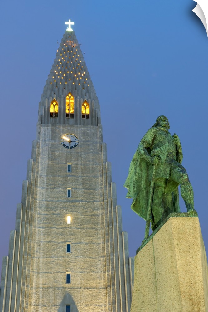 <p>The Hallgrims Church with a statue of Leif Erikson in the foreground lit up at night, Reykjavik, Iceland, Polar Regions</p>