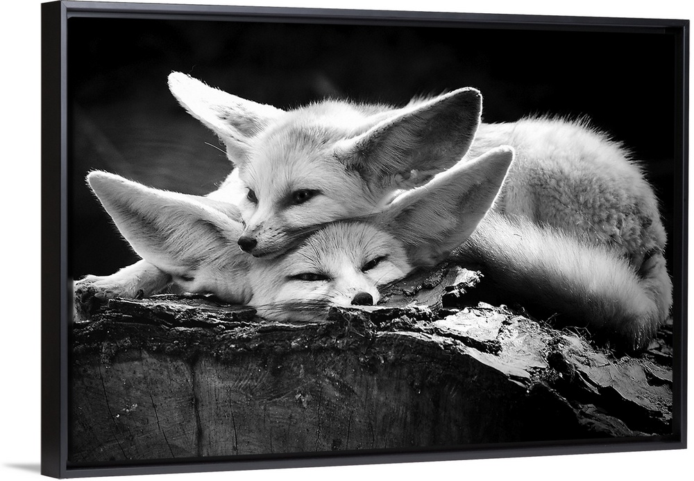 <p>Two adorable fennec foxes with big ears cuddling together on a log.</p>