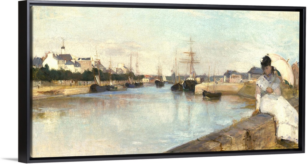 <p>The Harbor at Lorient, by Berthe Morisot, 1869, French painting, oil on canvas. Impressionist view of still water and ships in the Breton harbor, with a women in white seated on the seawall</p>