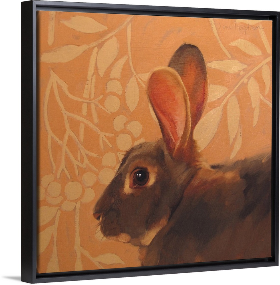 <p>Contemporary painting of a brown rabbit with long ears in front of an orange wall.</p>