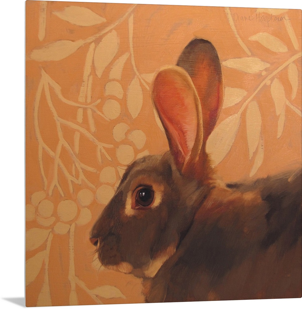 <p>Contemporary painting of a brown rabbit with long ears in front of an orange wall.</p>