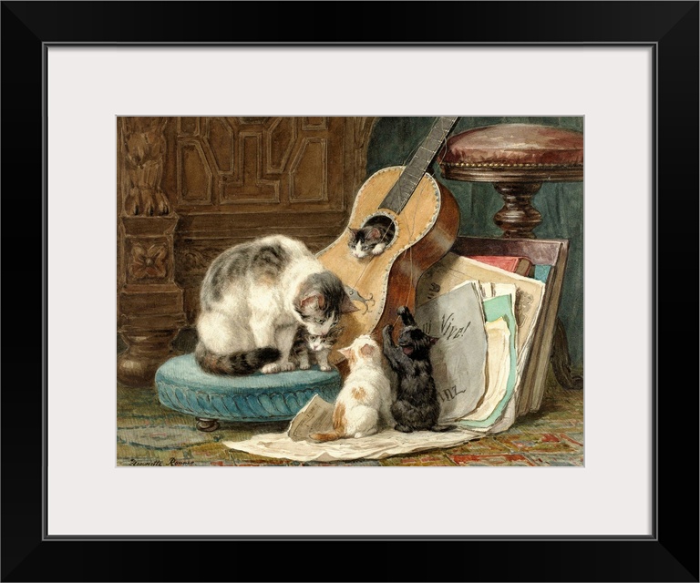 <p>The Harmonists, by Henriette Ronner, 1876-77, Dutch watercolor painting, on paper. A mother cat sits on a footstool near her four kittens who with its broken strings. One kitten sits inside the instrument.</p>