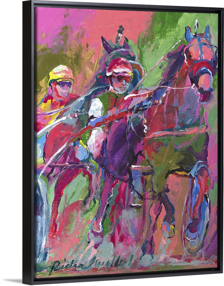 <p>Contemporary colorful painting of jockeys racing horse cart</p>