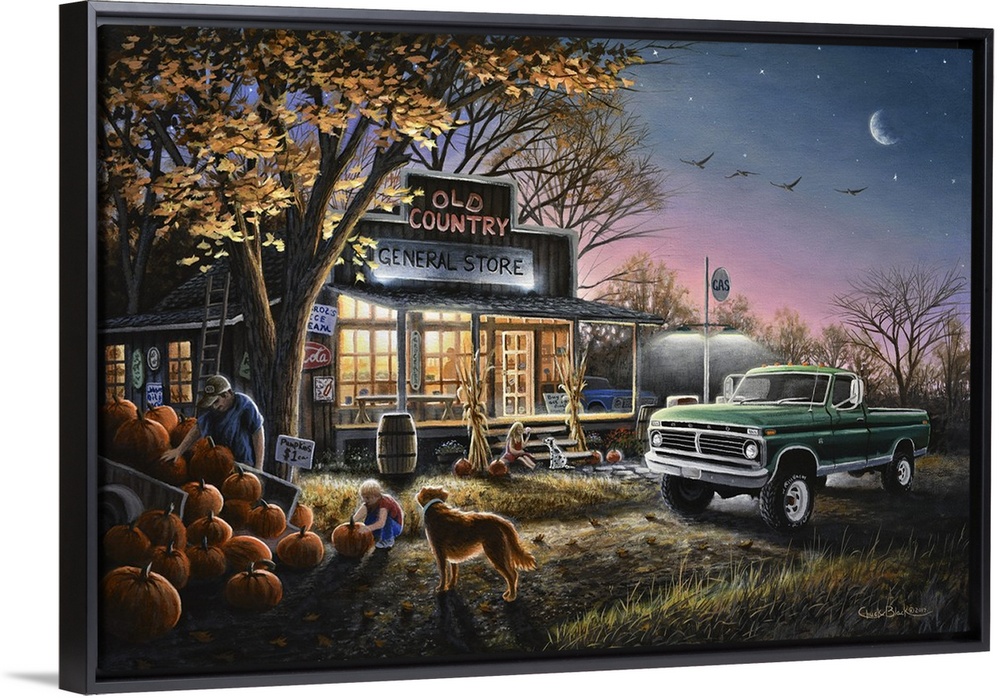 <p>Contemporary painting of an old general store at night with people picking pumpkins out front.</p>