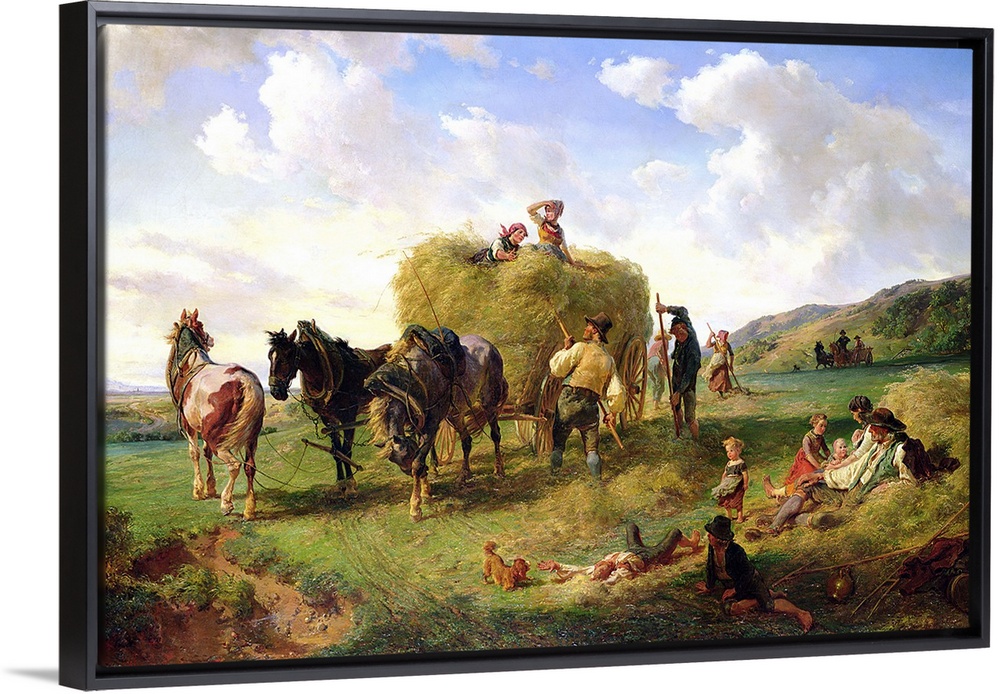 <p>Farmers collect hay and stack it onto a buggy that is being pulled by several horses. Children lay in the hay and on an open field that surrounds them.</p>
