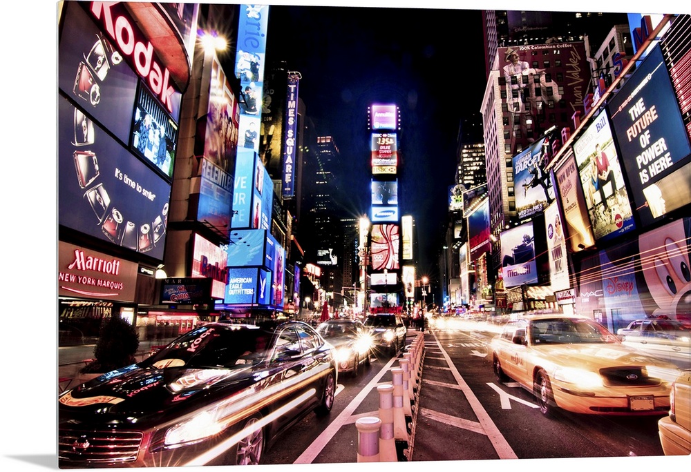 <p>Photograph of busy street at iconic city block in the "Big Apple." The streets are lined by tall lit up buildings and skyscrapers.</p>