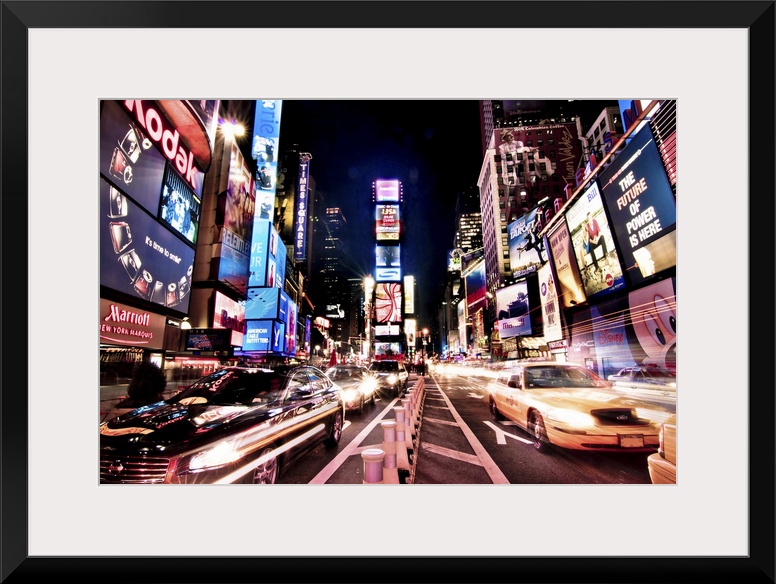 <p>Photograph of busy street at iconic city block in the "Big Apple." The streets are lined by tall lit up buildings and skyscrapers.</p>