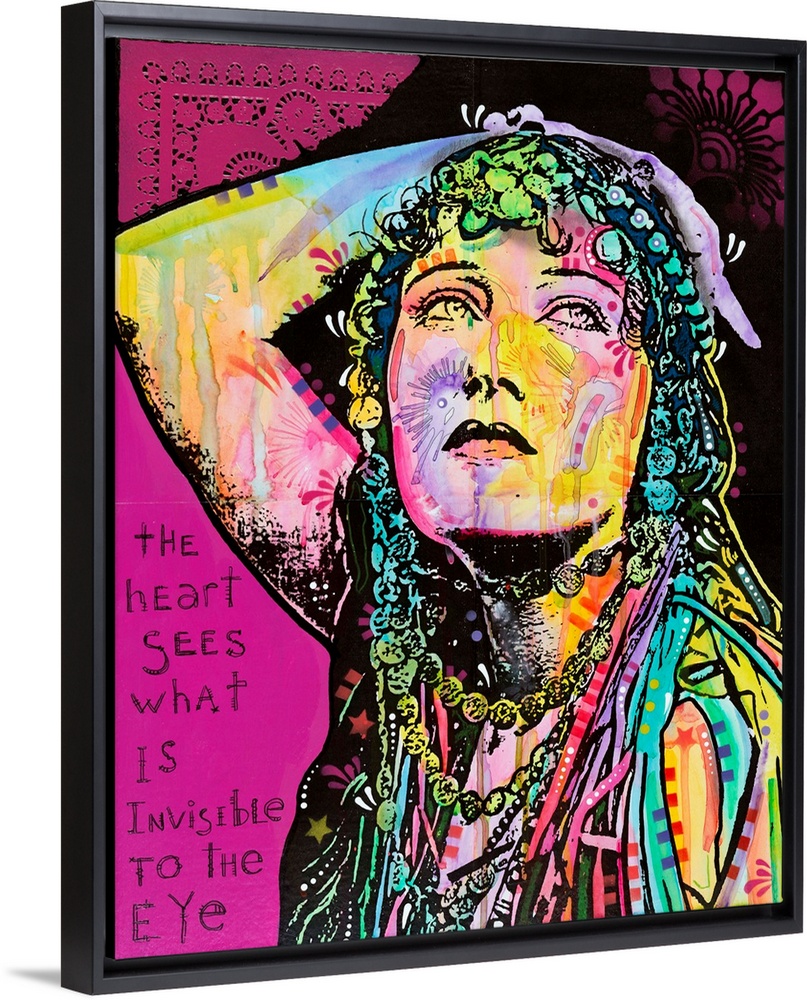 <p>Pop art style artwork of a colorful woman with graffiti like designs on a bright magenta background with text that reads "the heart sees what is invisible too the eye"</p>