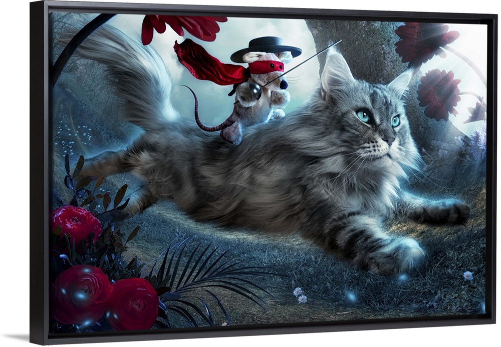 <p>A plush mouse dressed like Zorro rides a cat through a forest.</p>