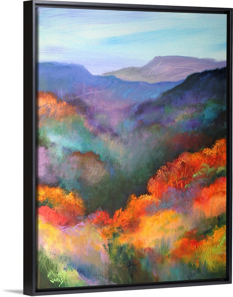 <p>Tall canvas painting of brightly colored trees with mountains in the distance.</p>