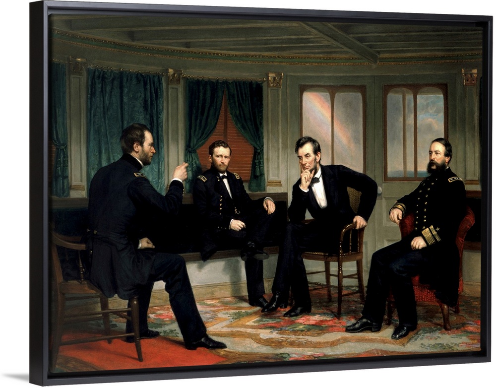 <p>Civil War painting of The Peacemakers, by George P.A. Healy, depicting the historic meeting of the Union High Command during The American Civil War. Featured in the painting are General William Tecumseh Sherman, General Ulysses S. Grant, President Abraham Lincoln, and Rear Admiral David Dixon Porter. The strategy session took place on Grant's private dispatch boat, The River Queen.</p>