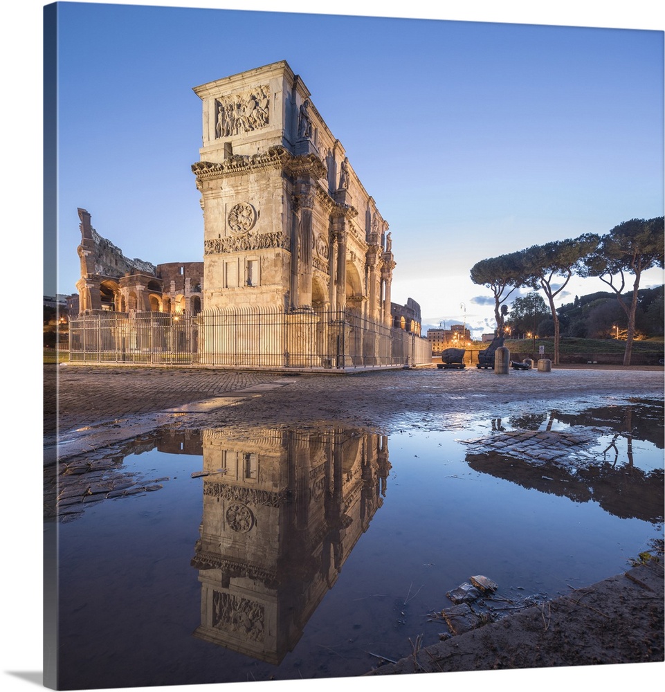 <p>The historical Arch of Constantine reflected in a puddle at dusk, Rome, Lazio, Italy</p>