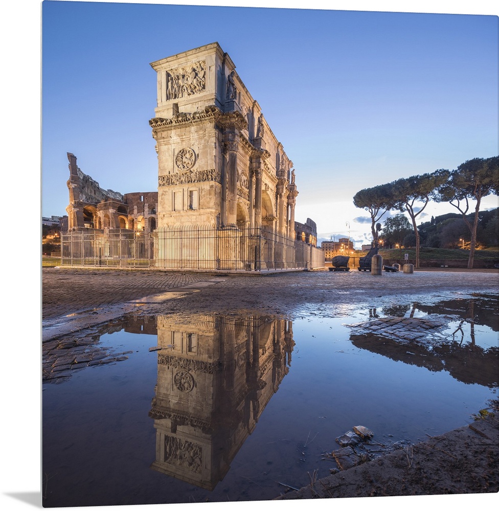 <p>The historical Arch of Constantine reflected in a puddle at dusk, Rome, Lazio, Italy</p>