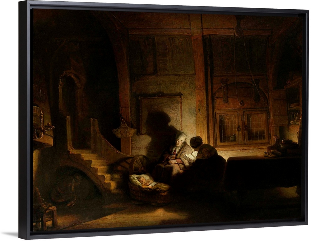 <p>The Holy Family at Night, by workshop of Rembrandt van Rijn, 1642-48, Dutch painting, oil on panel. Interior lit by candlelight, Mary reads from a book. Anna holds the cord to rock the cradle. Joseph is left under the stairs.</p>