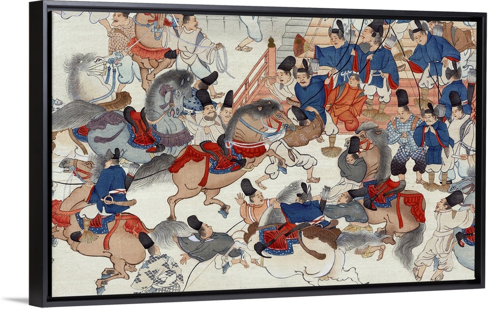 <p>The horse show Battle in front of a palace by Mitsunaga Tokiwa, active 12th century. Print, woodcut, colour. Print shows a confusion of men and horses passing in front of steps possibly leading to a palace during a horse show; some of the men standing on.</p>