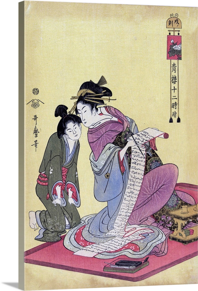 <p>The hour of the dog by Utamaro Kitagawa (1753-1806). Colour woodcut. Print of a young woman sitting on a mat, holding a long scroll and writing materials. She has turned to the left to speak with a young servant or apprentice kneeling behind her.</p>
