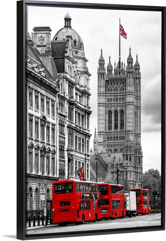 <p>Row of double decker buses on the street by the House of Parliament in London, England.</p>